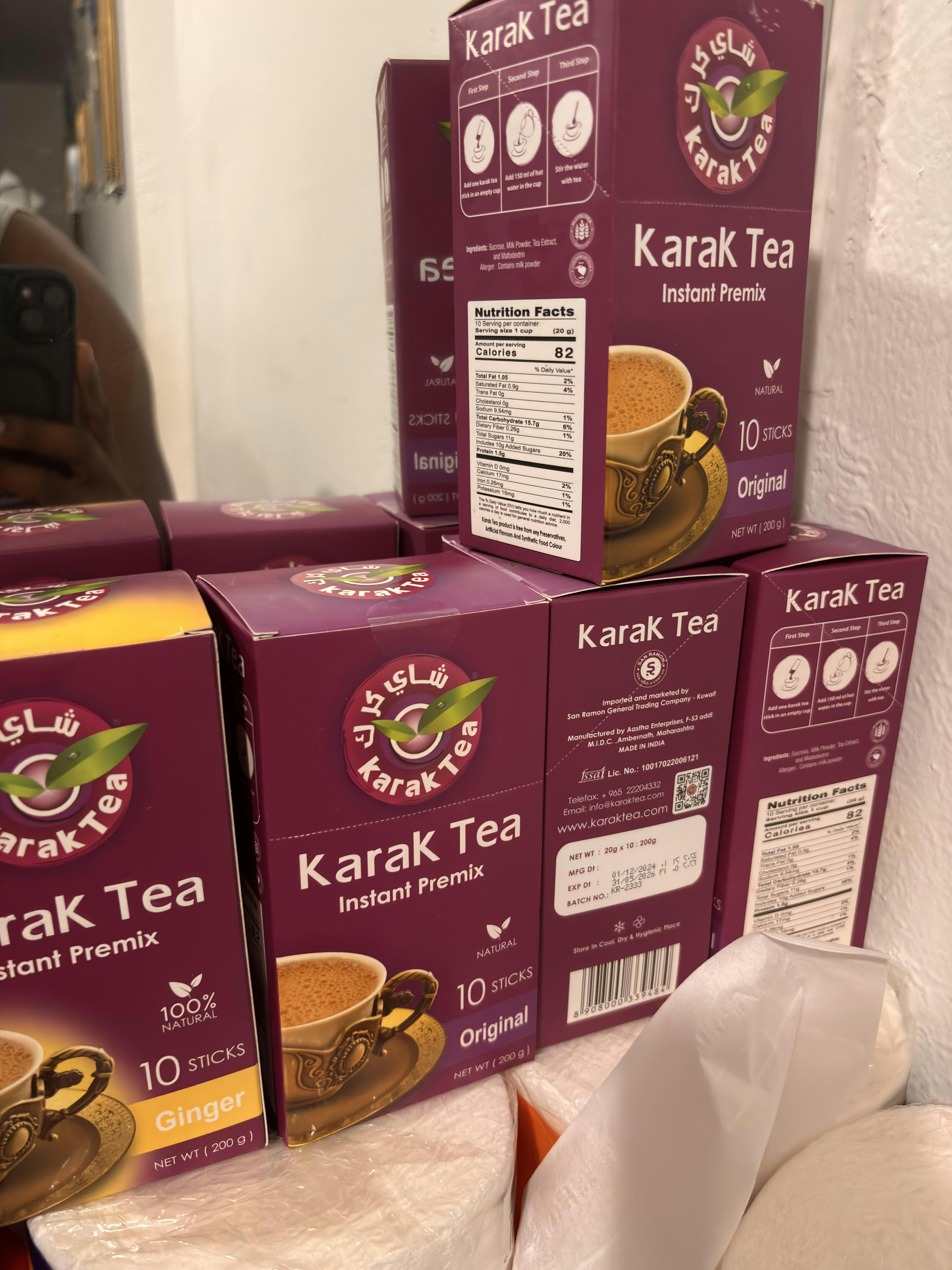 - Karak Tea is a premix tea with other flavors. This listing contains Ginger flavor. It comes in a pack of 10. Made from 100% natural ingredients. The ingredients are Sucrose, Milk Powder, Tea Extract, Maltodextrin, and Ginger. The tea is free from and Preservatives, Artificial Ingredients, and Synthetic Food Color. How to use it? First, add the powder to the cup. Second, boil the water. Third, add the hot water to the cup. Fourth, stir and Enjoy!